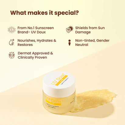 Pamper your lips with UV Doux Lip Lightening Balm SPF 40 PA++. This dermatologically tested formula provides high-level UV Protection.